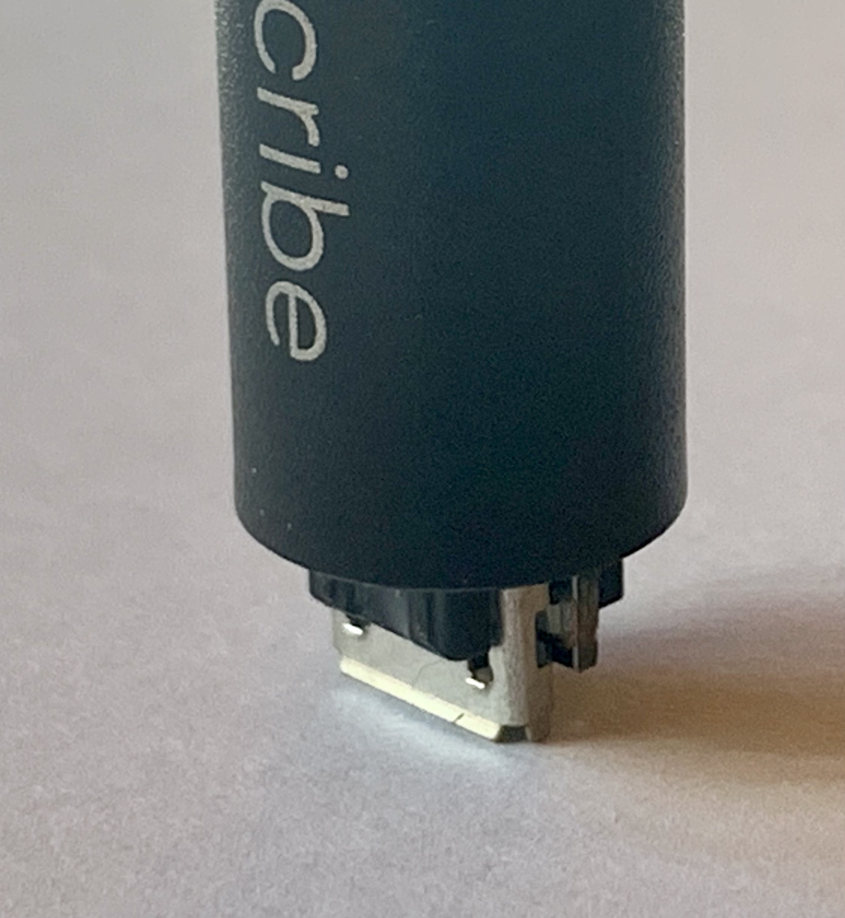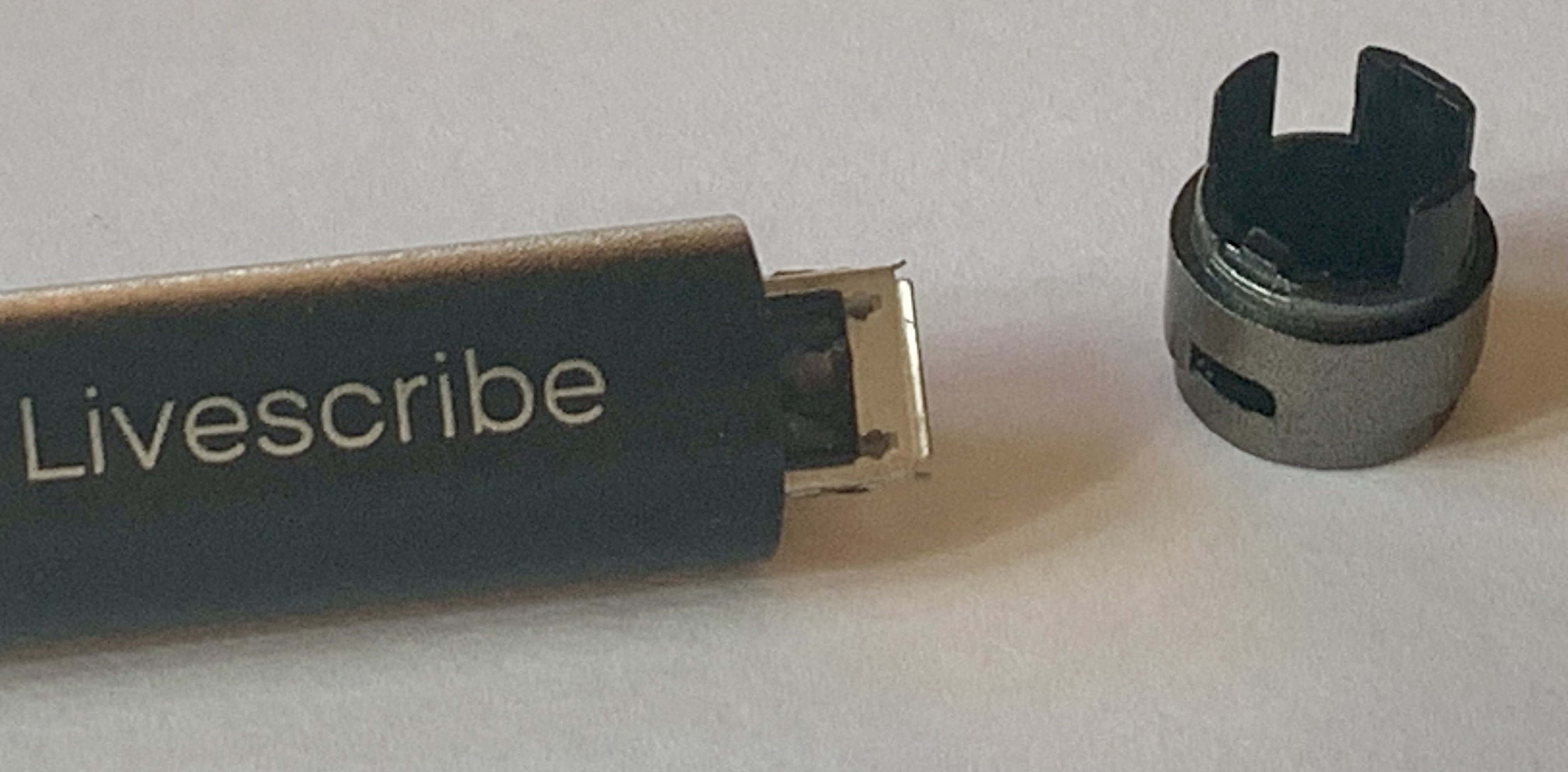 It took a bit before I could reliably open a Symphony pen without grossly defacing it. Do not try to do this with vice-grips or pliers with cloth wrapped around the grippy ridges – you will put claw marks into the soft plastic that makes up the barrel and the end plug! You can move the plug on the USB end back and forth with your fingers to loosen it. Once loosened, it will pull straight off. It’s just there to protect the USB socket. Don’t try to remove the facia surrounding the tip of the refill. It doesn’t really detach from the innards of the pen. Remarkably, the guts of the pen are kept from sliding out of the barrel by the plug (which you’ve removed) and by some double-sided tape that grabs the barrel and the working parts of the pen. If you gently press the USB socket into the tabletop, straight up and down, mind you! The double-sided tape will eventually let go of the barrel, and you can pull the working parts of your Livescribe Symphony straight out!