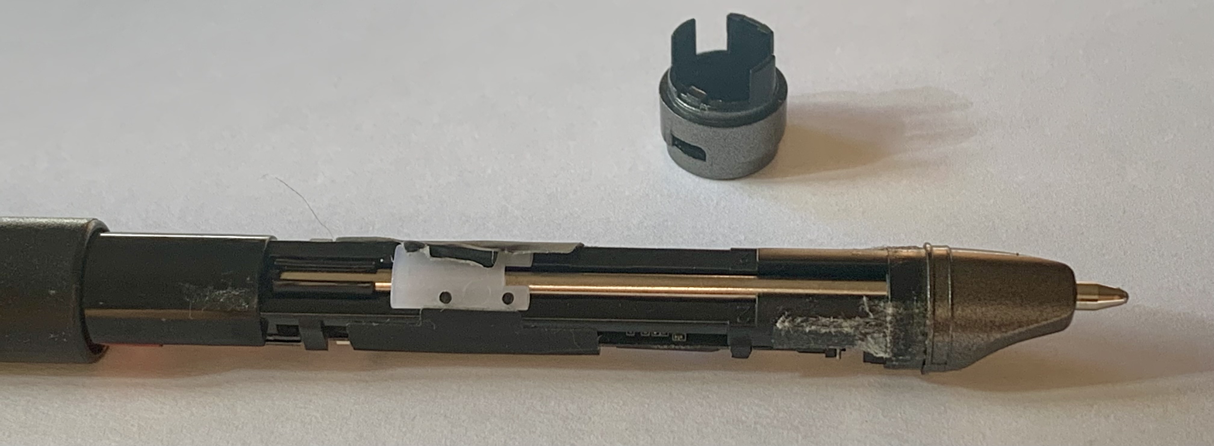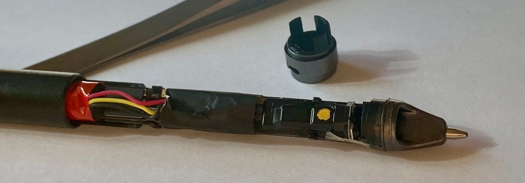 At this point, grab the working end of the pen and pull it straight out of the barrel. You will have the working bits out now. There is a lot of tape holding things in place. The LED is under the white plastic housing, and you can see the ballpoint pen refill. On the other side, you see the colored wires going from the battery (under the red tape) up to the JST connector (hidden under the black tape).